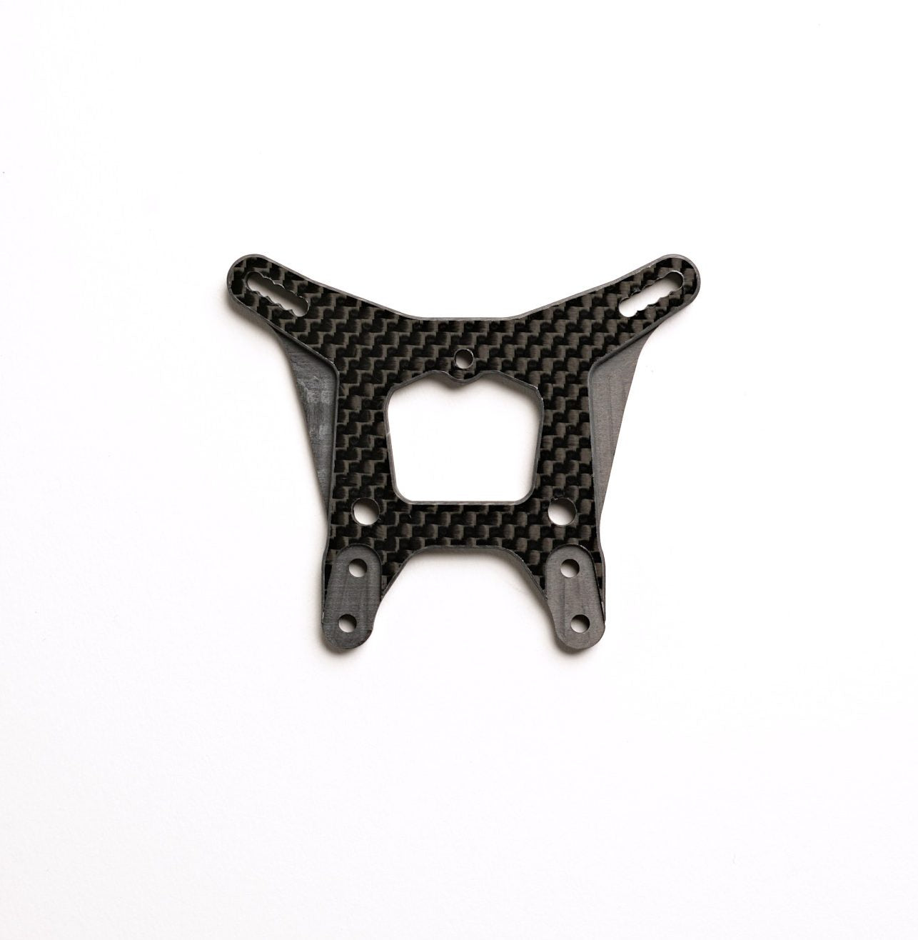 5mm carbon fiber front shock tower for the Team Associated SC6.2 and T6.1. The tower has webbing for added strength. All edges have a nice chamfer. It incorporates micro tune shock positioning by adding a hole in between the one and two holes of the stock tower. The back of the tower has a 1mm recess to keep the stock shock angle.