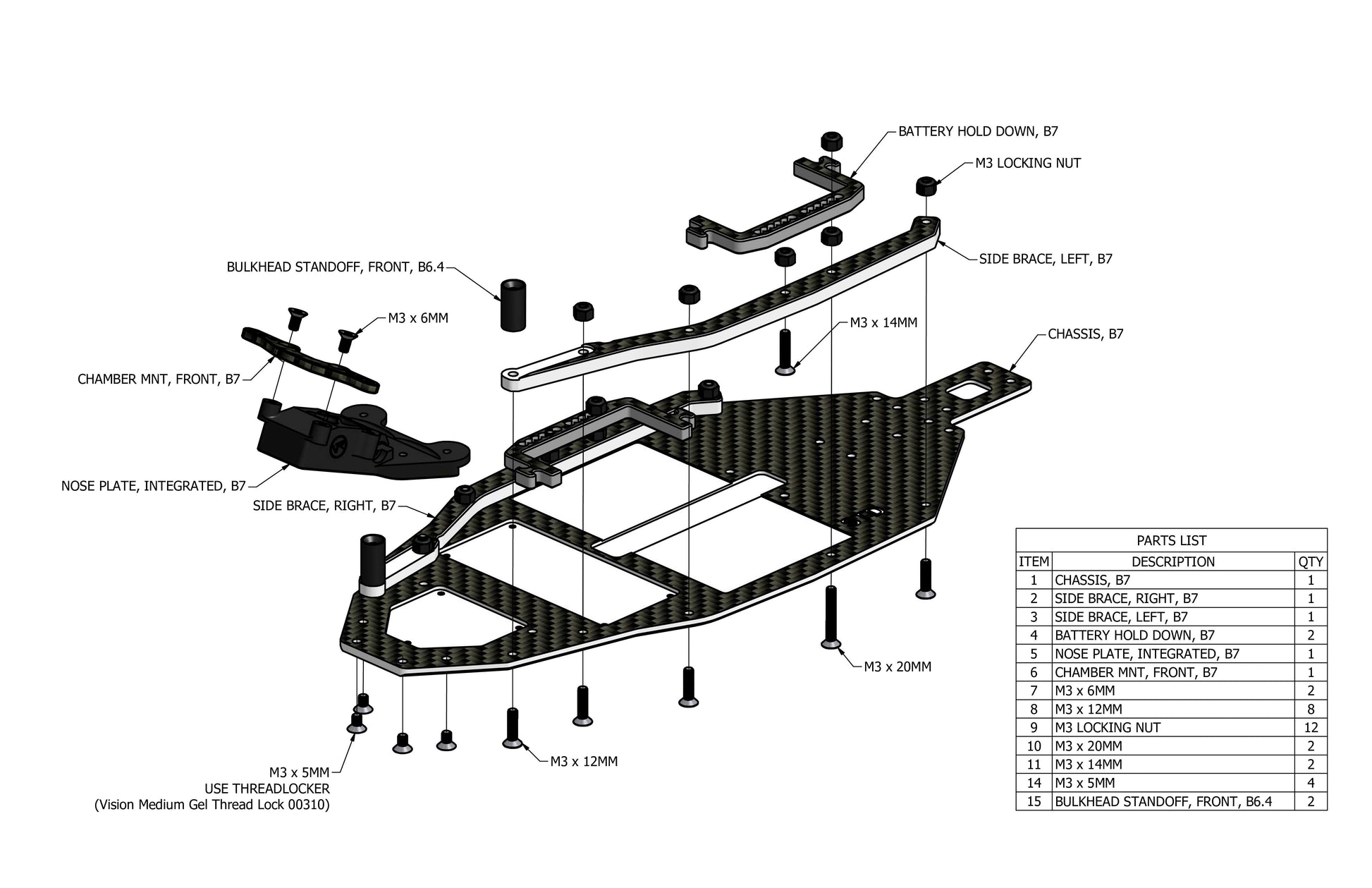 Introducing the carbon chassis for the Team Associated B7. This chassis takes 20 grams of weight off. Includes chassis, side braces, aluminum nose plate, battery braces, aluminum stand offs and mounting hardware.